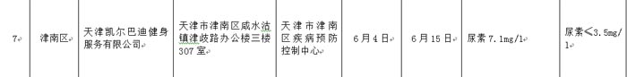 36 | 津南區(qū) | 天津凱爾巴迪健身服務有限公司 | 天津市津南區(qū)咸水沽鎮(zhèn)津歧路辦公樓三樓307室 | 6月15日 | 檢出不合格項 |