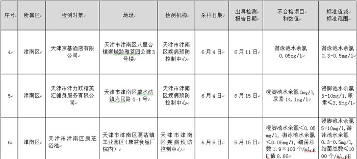 35 | 津南區(qū) | 天津市津力躍精英匯健身服務有限公司 | 天津市津南區(qū)咸水沽鎮(zhèn)為民路4-1號 | 6月15日 | 檢出不合格項 |