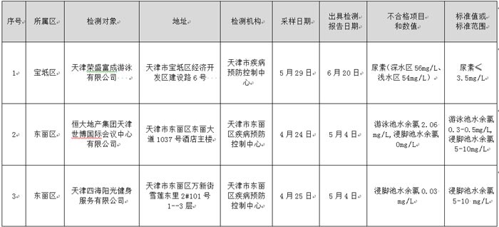 54 | 寶坻區(qū) | 天津榮盛富成游泳有限公司 | 天津市寶坻區(qū)經濟開發(fā)區(qū)建設路6號 | 6月20日 | 檢出不合格項 |